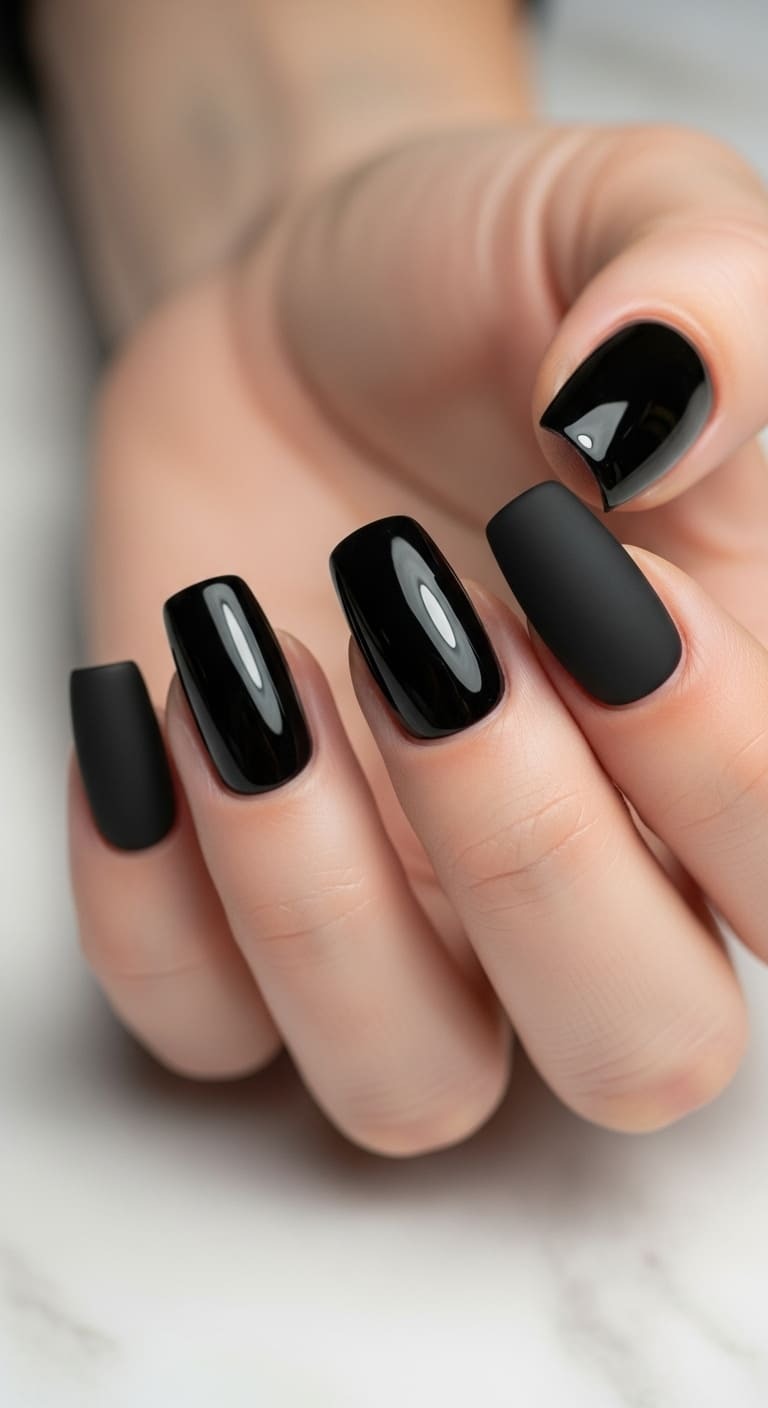 Black nails are back in a bold but elegant way—this time with a mix of finishes. Glossy black with a matte French tip (or vice versa) looks edgy and fashion-forward.