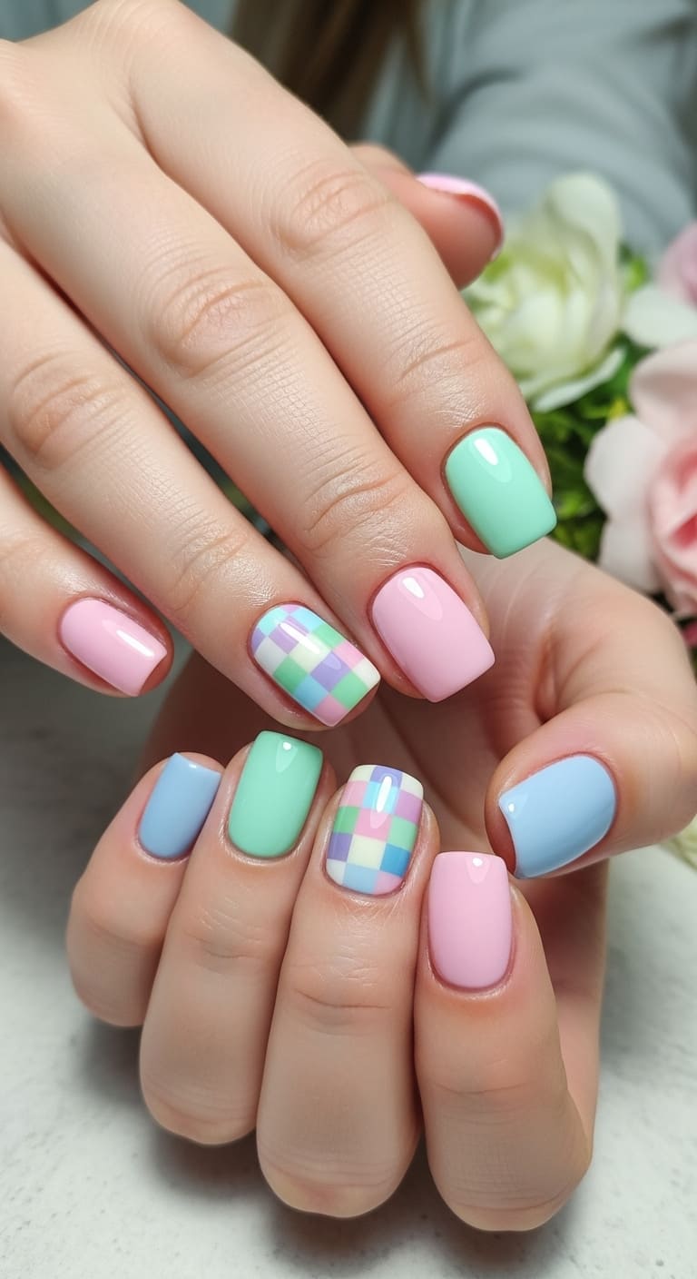 Checkerboard designs are getting a pastel makeover this year. While a full checkerboard mani is a bit advanced, one or two accent nails make it beginner-friendly.