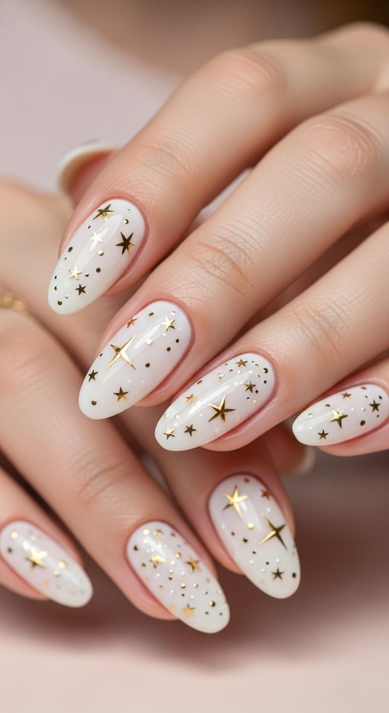 This dreamy combo has taken over social feeds for a reason—it’s soft, celestial, and totally wearable. The milky white base gives your nails a fresh, clean look while tiny gold stars add a magical pop.